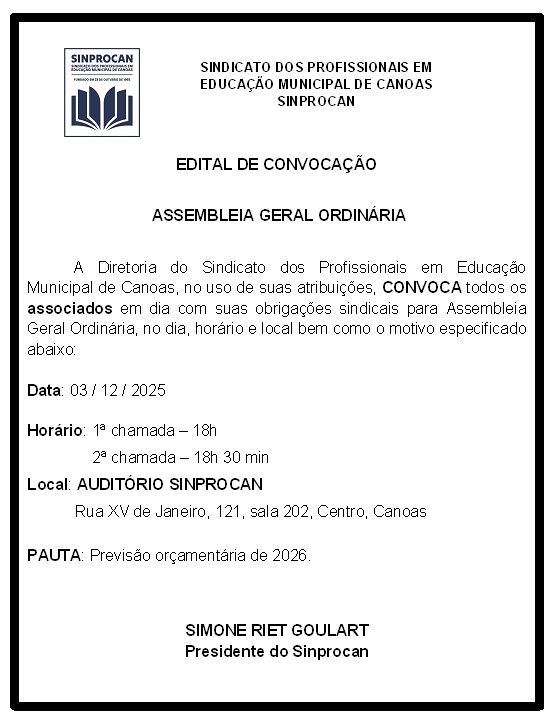 A Diretoria do Sindicato dos Profissionais em Educação Municipal de Canoas, no uso de suas atribuições, CONVOCA todos os associados em dia com suas obrigações sindicais para Assembleia Geral Ordinária, no dia, horário e local bem como o motivo especificado abaixo: